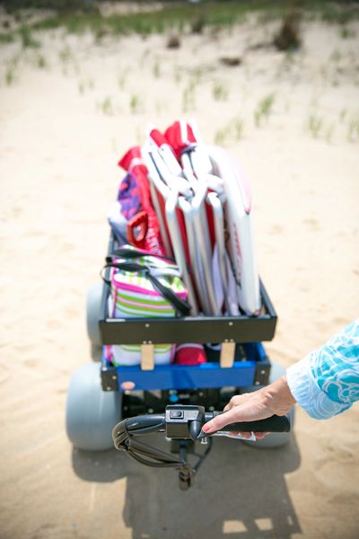 Sandhopper is the ultimate battery powered electric wagon. Simply place your hand on the control handle and depress the thumb switch while walking in front of the wagon steering and controlling its direction and speed. The exclusive Auto-Brake system stops the Sandhopper as soon as your release pressure from the throttle. Sandhopper can handle the sand with ease, providing you with 4 to 5 miles of range when fully charged all while carrying hundreds of pounds of gear. With our standard battery gauge meter, you'll always know how much charge is left. Our wagons operate on a 24 volt battery and use a 750 watt electric motor. Additionally you may add a more powerful motor and controller for extra power for larger loads.
